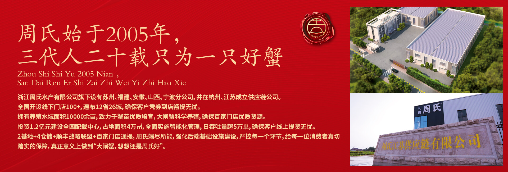 周氏水產(chǎn)精品大閘蟹,14年匠心沉淀,全國(guó)87家直營(yíng)門店,100只大閘蟹只精選最優(yōu)50只。不虛標(biāo)規(guī)格,不玩???